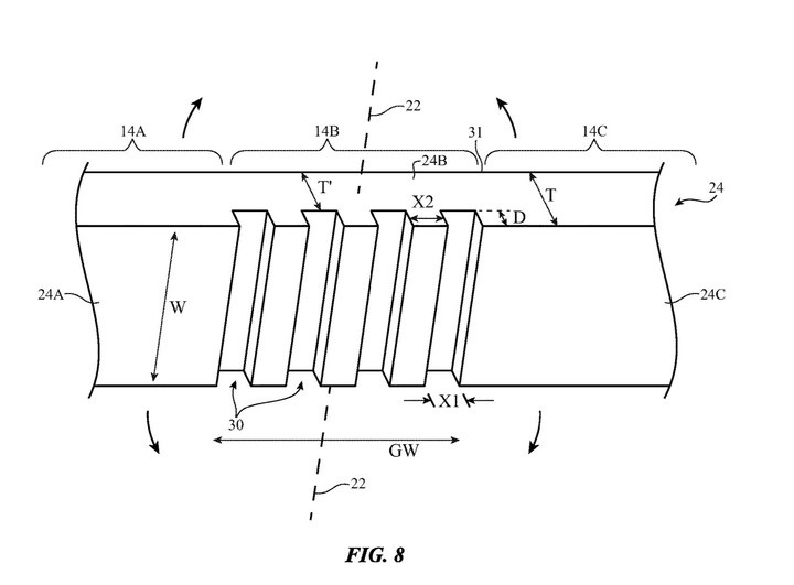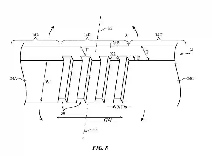 【苹果可折叠iPhone专利曝光:柔性屏幕设计独特】7月6日消息 据 Seekdevice 报道,近日一项苹果最新可折叠 iPhone 专利曝光:其采用了一种十分独特的柔性屏幕设计来解决折叠问题。苹果公司计划在玻璃内部切出一系列凹槽,这将使玻璃拥有高度灵活性,这一过程在木材中称为刻缝,同时这些凹槽被与玻璃具有相同折射率的弹性体聚合物或流体所填充,而显示屏的其余部分将是正常的。