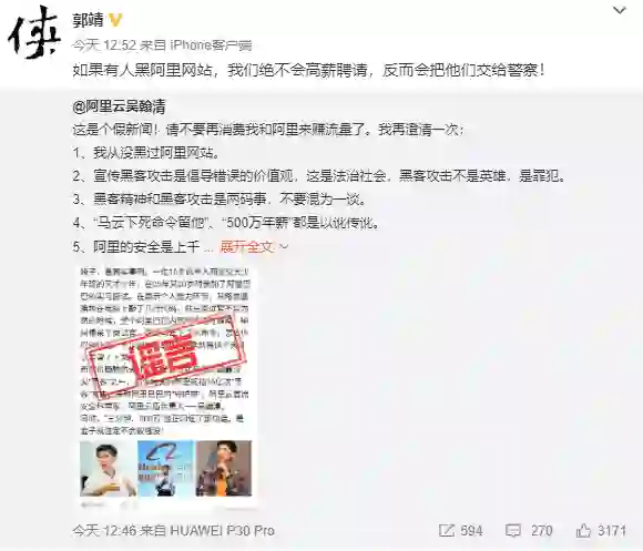 网络盛传的“阿里天才黑客”吴翰清通过微博辟谣:“我从没黑过阿里网站,‘马云下死命令留我’、‘500万年薪’都是以讹传讹的假新闻。”阿里巴巴集团风险委员会主席邵晓锋也转发微博证实了吴翰清的说法,并表示:“如果有人黑阿里网站,我们绝不会高薪聘请,反而会把他们交给警察。”