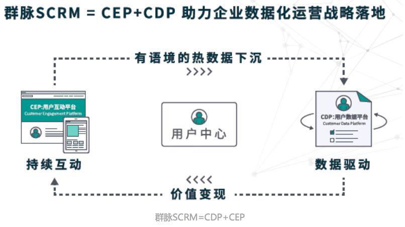 “群脉SCRM打造的是一个用户生态数字化运营平台,由用户数据平台和用户互动平台共同驱动:以用户为中心,持续互动驱动数据变现;反过来,有价值的数据继续驱动与用户的持续互动,形成‘高销售转化’的效能”。”