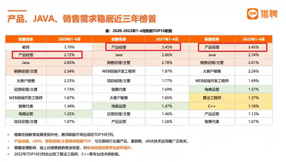 但实际情况是:根据猎聘《2022互联网行业中高端人才报告》显示,在2020-2022年Q1热招岗位中,产品经理的招聘需求稳居TOP3!