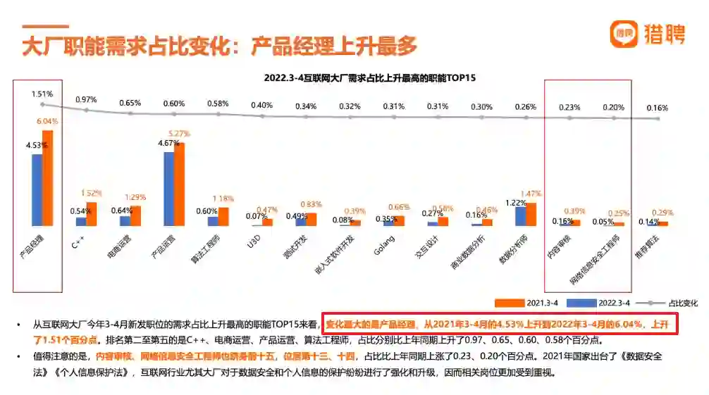 而在互联网大厂所招聘的岗位中,产品经理的需求量上升也最多!