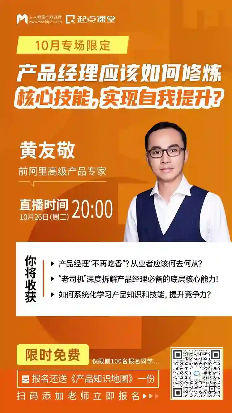 我们特邀前阿里高级产品专家@黄友敬老师在线直播,深度拆解产品经理必备的底层核心能力!教会你如何系统化学习产品知识和技能,提升竞争力!