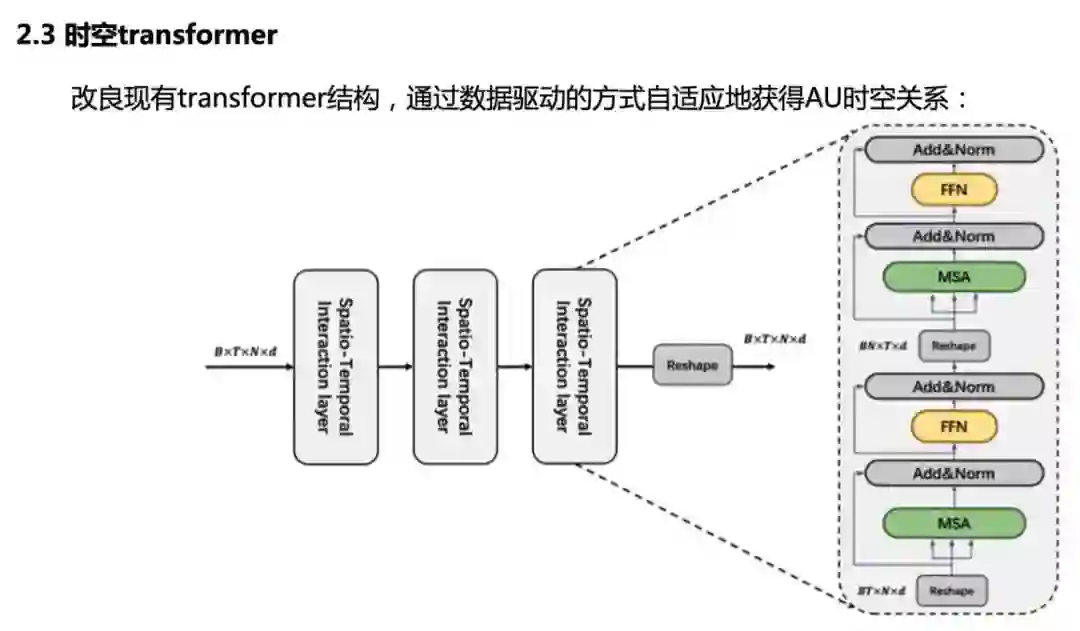 时空Transformer模块通过时空特征交互自适应地捕获时空关系。为了进一步建模AU之间的时间关系,在时间维度上利用自注意力机制融合AU特征。