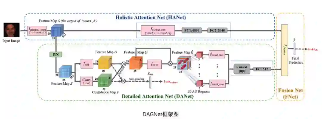 接下来,宋同学介绍了在安高云教授指导下构建的用于面部运动单元检测的双注意力网络。具体来讲,这是一种基于AU标签的语义分别从全局和局部角度学习特征表示用于面部AU检测的双注意力引导网络(DAGNet)。实验框架如下所示: