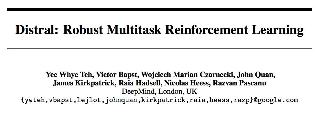 我们提出了 Distral,一种用于提取(distilling)和迁移多任务强化学习中一般行为的通用框架。在实验中,该最终算法不仅能更迅速地学习、产生更好的性能,同时还能更加稳健和鲁棒地设置超参数。我们发现 Distral 能显著地优于为多任务和迁移强化学习共享神经网络参数的标准方法。