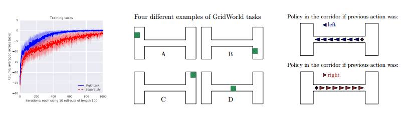 图 3: 左图:两个空间网格世界中的学习曲线。DisTraL 智能体(蓝色)学习的更快,并向更好的策略收敛,从整体上证明了更稳定的学习。中图:任务的实例。绿色代表目标位置,为了每一任务统一被采样。在每一个 episode 开始之时,开始位置统一被采样。右图:习得的提取策略 π0 只在走廊之中,并受限于之前向左/向右的行动,没有先前的奖励。箭头的大小描述行动的概率。注意向上/向下行动的概率可以忽略。模型在走廊中学习保持行进的方向。