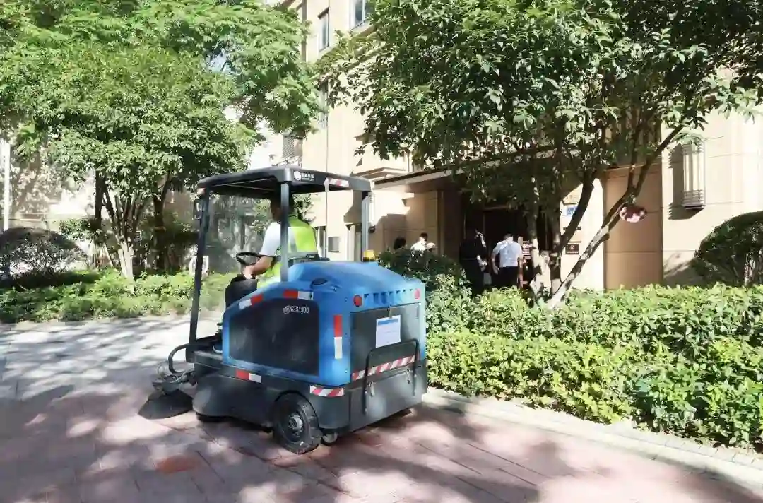 2022年7月,在武汉唐家墩街道“蝶城”内,一名保洁人员开着清洁机打扫小路,直接提升其工作效率。