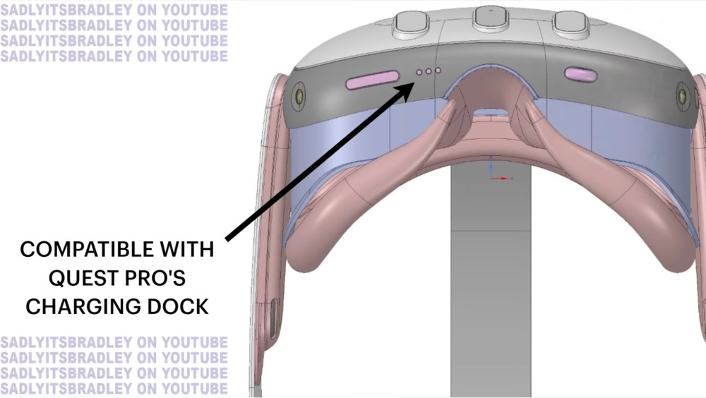 Quest 3右下边底座有3个金属触点,同样此前爆料的Quest Pro设计图中也有类似的设计。