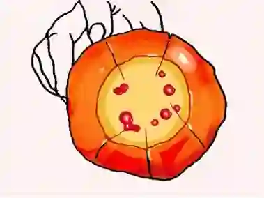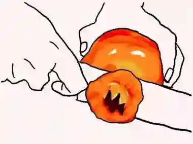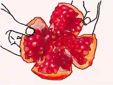 在离石榴顶花大概1-2公分的位置转圈切下,然后在看见薄膜的位置竖划几刀,再掰几下,就能轻而易举地将石榴“果皮分离”,看到干瘪的外皮下包裹着的排列紧密的鲜红色的果实。