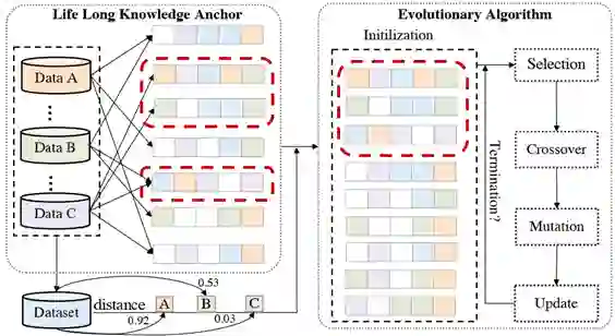 首先,论文的作者提出了基于终身知识锚点的进化算法。而其中极富创新性的全自动机器学习框架,首次打破了现有自动机器学习中各搜索空间的独立设计,并使用数据集知识锚点加进化算法来加速搜索,解决了在超大空间搜索最优方案的设计难题。