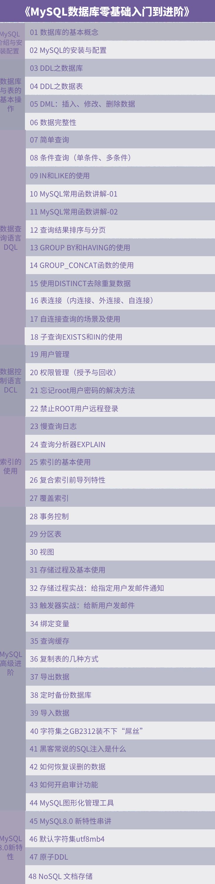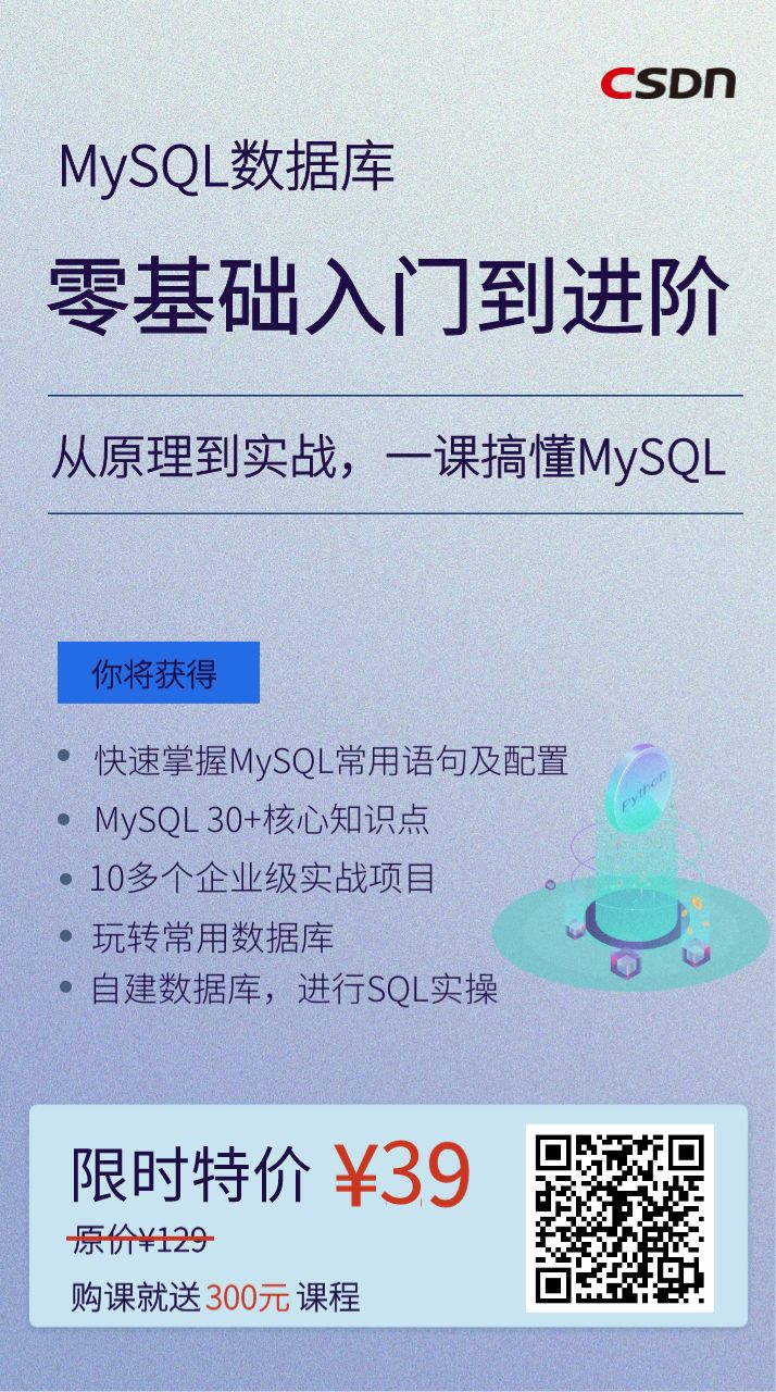 48讲的《MySQL零基础入门到进阶》+5门价值300元编程课+社群答疑=39元