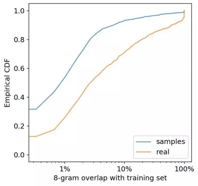 有人猜测模型会不会只是简单地记住了文本模版,然后再正确地把它们重复出来就可以了。这一点在他们的论文中也进行了讨论,作者们展示了 GPT-2 生成的样本和训练数据集之间的单词重复率,这个重复率实际上比测试集和训练集之间的单词重复率还要低。换句话说,GTP-2 表现出的记忆行为比随便取一段人类撰写的文字还要低。如果我们要说这个模型具有非平凡的泛化能力的话,这算是一条挺强力的证据了。
