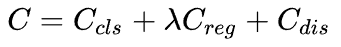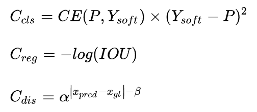 使用AGM预测的分类概率和检测框会送入DSLA模块计算Matching Cost。Cost函数由三部分组成:classification cost,regression cost以及distance cost:
