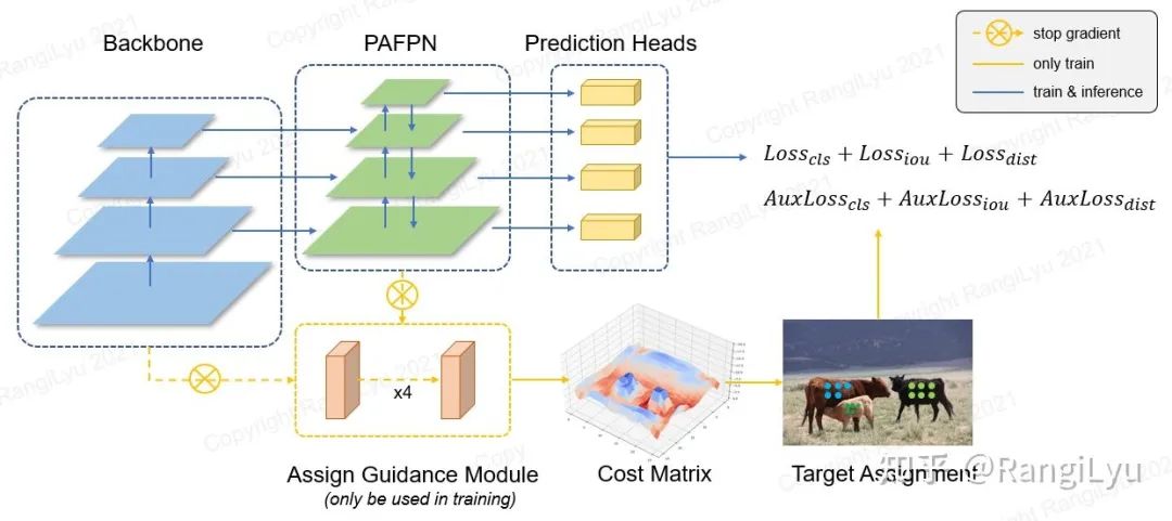 与之前的这些工作不同的是,NanoDet-Plus中设计了一种更为简单也更为轻量的训练辅助模块Assign Guidance Module(AGM)并配合动态的软标签分配策略Dynamic Soft Label Assigner(DSLA),来解决轻量级模型中的最优标签匹配问题。NanoDet-Plus的整体架构如下图所示: