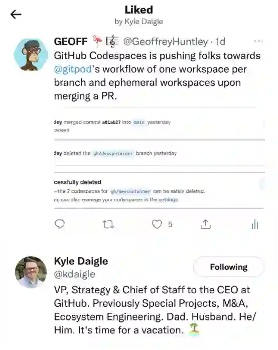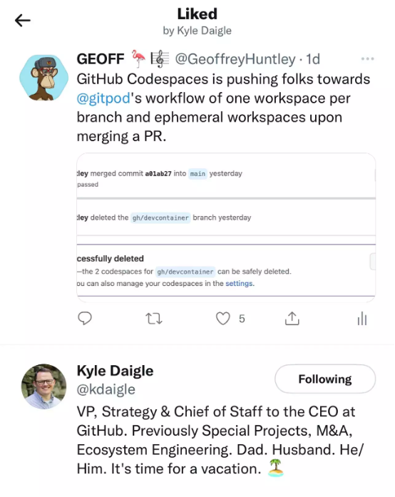 Huntley 表示自己很珍惜在 Gitpod 工作的时光,同事们既亲切又聪明。但他认为,要让产品真正发光发热,Gitpod 还需要解决结构、战略和领导等层面的诸多问题。“我是等不到那天了,所以就此别过吧。”