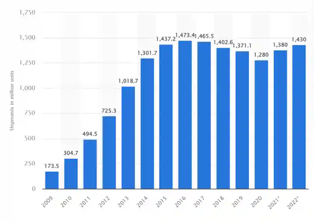 国内市场研究机构潮电智库曾给出预测,2022年至2024年,全球智能手机出货量将在11亿台至12亿台之间波动,相比巅峰时期的15亿部,相去甚远。
