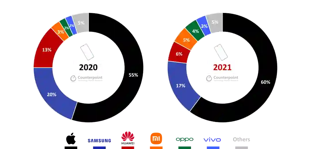 当然这一方面也是因为国内厂商冲击高端市场走的并不顺利,华为留下的大部分高端机市场,还是被苹果抢去了大部分。