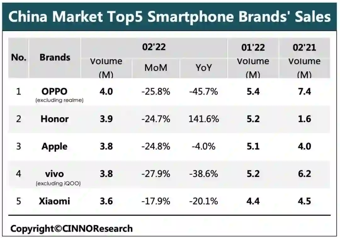 CINNO Research报告中提到,从2月底至今这一个多月里,国内多地疫情出现反复,这也为国内手机厂商复工复产带来较多不利影响,是2月手机整体表现下滑的主要原因之一。