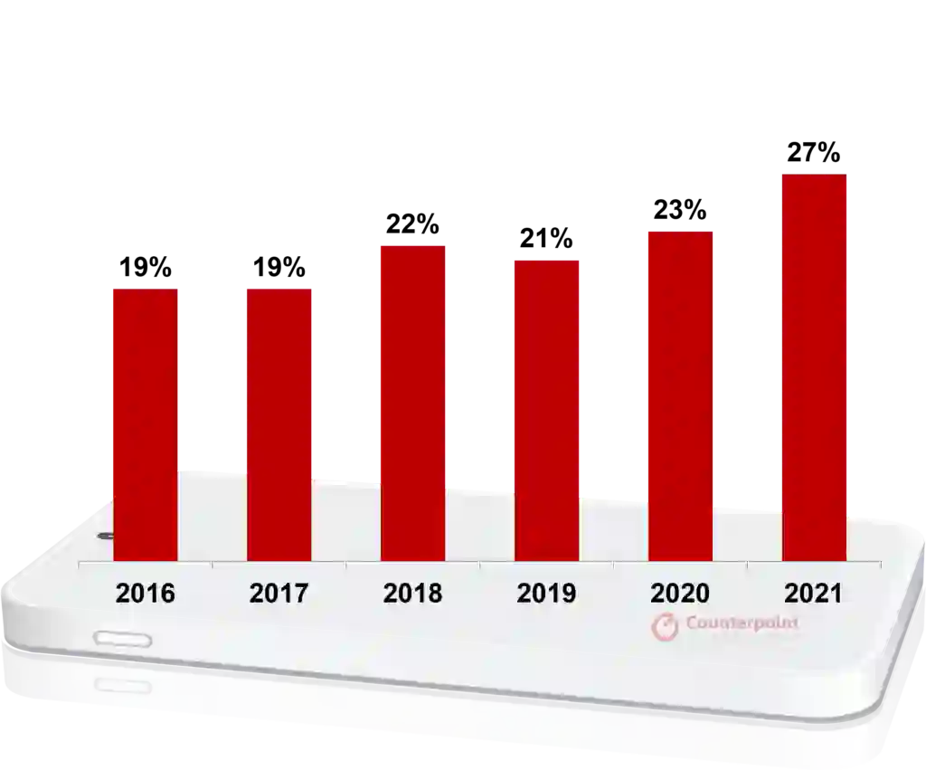 根据Counterpoint数据,2021年全球400美元(约合人民币2541元)以上智能手机的销量占比已经增长至27%,在短短一年内就增加了4个百分百点。