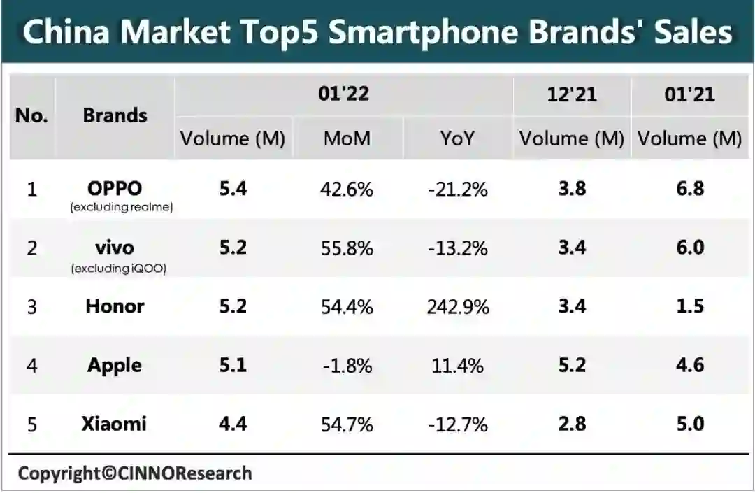 从该机构发布的1月国内市场数据中我们也能看到类似的情况,OPPO、vivo、小米等几家国内头部手机厂商的销量同比均有下降,且最大降幅超过了20%。