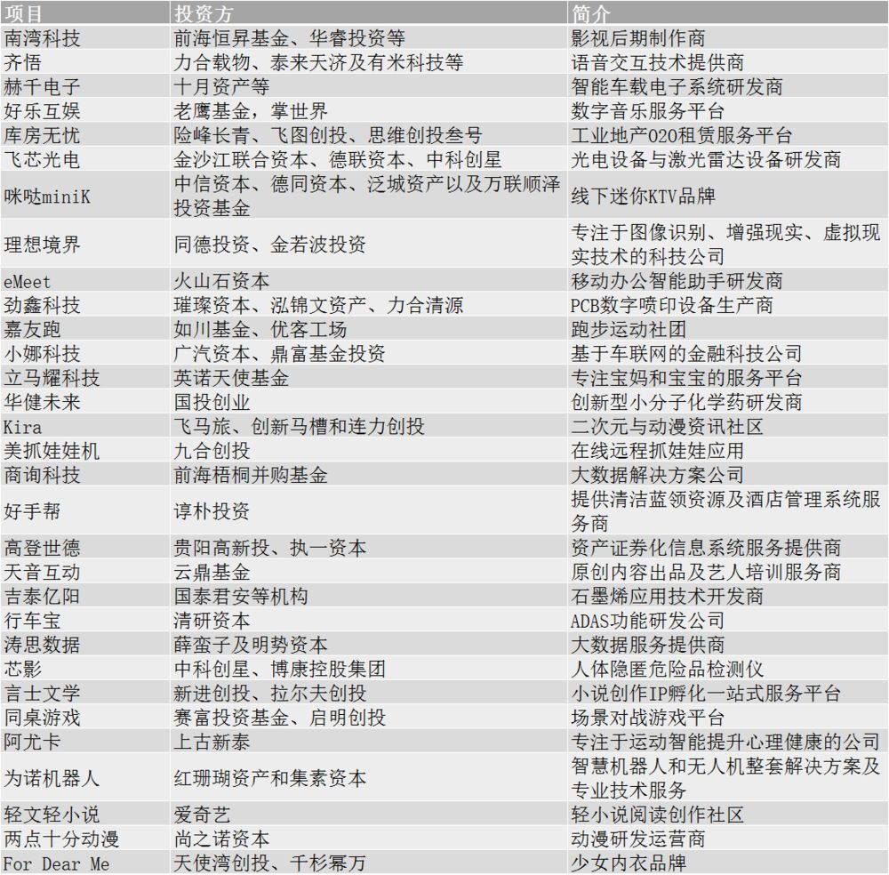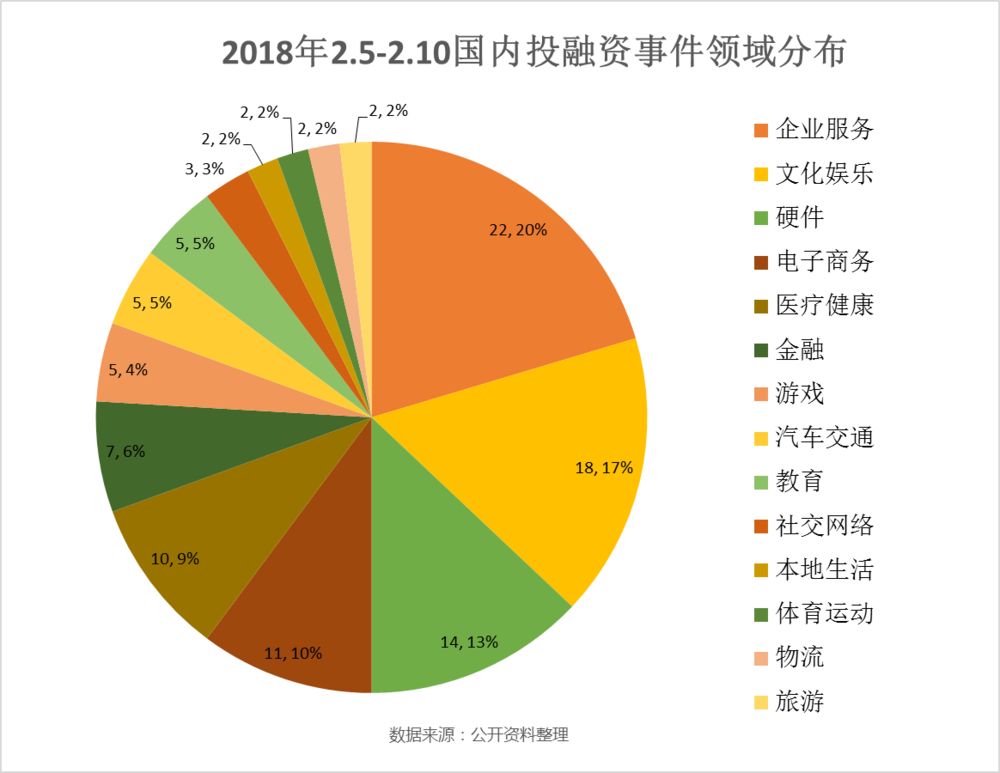 文化娱乐18起融资事件中媒体及阅读领域发生5起,互联网电视台“哆唻播”获4000万人民币的A+轮融资,投资方为沃衍资本;极简信息推送工具“即刻”获未透露金额的C轮融资,投资方为腾讯;网络小说IP孵化器“言士文学”获未透露金额的天使轮融资,投资方为新进创投;情感内容类自媒体“程一电台”获数千万人民币的PRE-A融资,投资方为微影资本(微影时代);区块链资讯门户“火星财经”获未透露金额的战略融资,投资方为BeeChat。