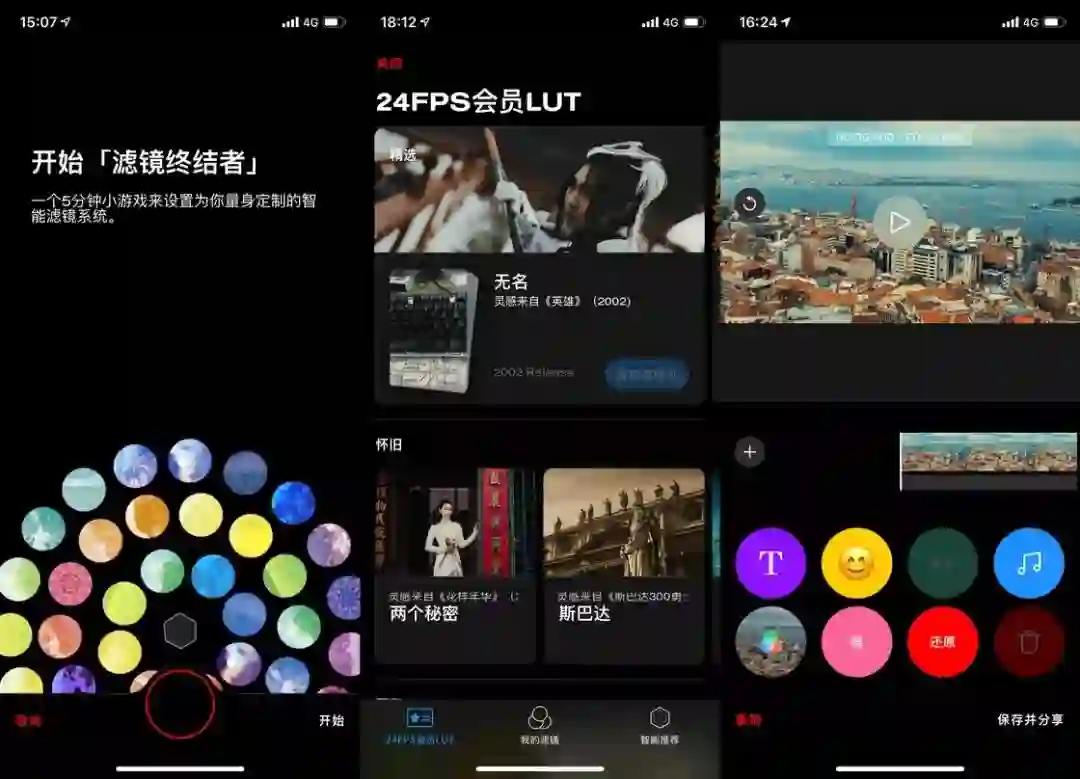 除了 LUT 调色外,泼辣 24 还支持智能滤镜效果,首次使用时你需要进行一些「抉择」,让应用了解你的感官喜好。之后它便会根据你的选择,提供你可能喜爱的滤镜效果,应用还会在日常使用中进一步了解你的喜好,不断优化自己的推荐算法,如果你有滤镜选择恐惧症的话,这一功能可以让你立刻解脱。
