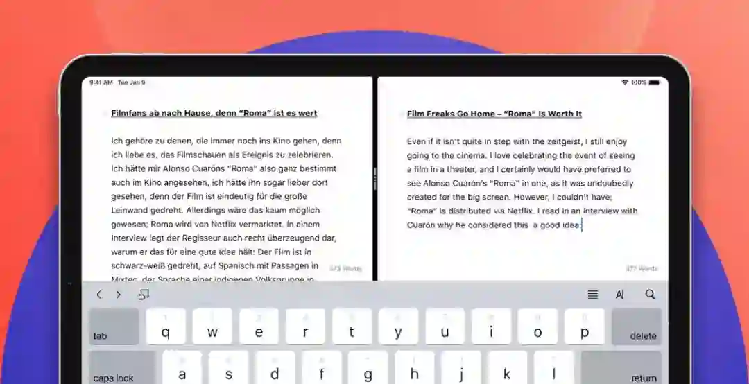 不过本次 V16 更受人关注的更新还是 iPad 上的分屏模式。Ulysses for iPad 可以在新版本中同时打开两个编辑器,所以你可以同时编辑两个文档。与此同时,你也可以利用分屏模式来实现所见即所得的预览效果,将其中一个窗口设为预览模式,即可实时预览另一个窗口中编辑器的内容,对于注重排版效果的人来说非常有帮助。
