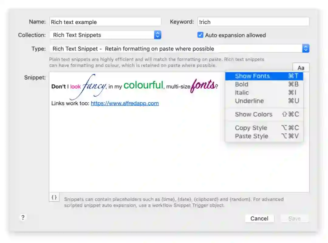 短语快速输入功能 Snippets 加入对富文本的支持,并且配有简单的富文本编辑菜单,包含字体、粗体/斜体/下划线、颜色等。内置的占位符功能添加随机值选项,并且新增了修饰符语法。