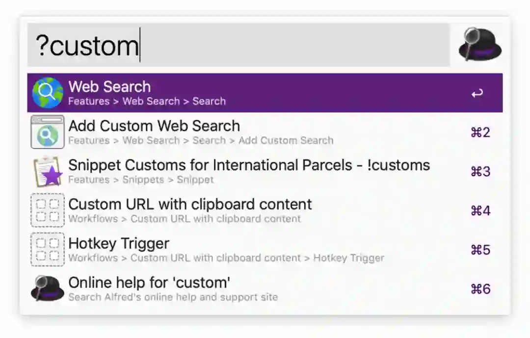 Alfred 输入框中搜索?关键词,可以直达 Alfred 偏好设置中的各种功能。构成 Workflow 的每个对象、Snippets 中的每条片段,以及网络搜索配置,都可以通过搜索准确定位,进行修改。此外,在 Alfred 中搜索「?hotkey」、「?keyword」会列出包含内置功能与 Workflow 在内的所有快捷键与动作关键词,不必再为记不住而烦恼。
