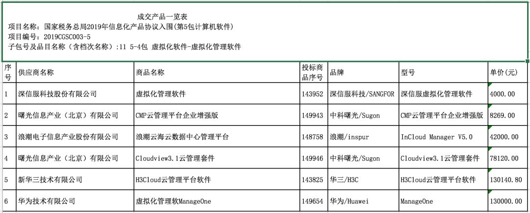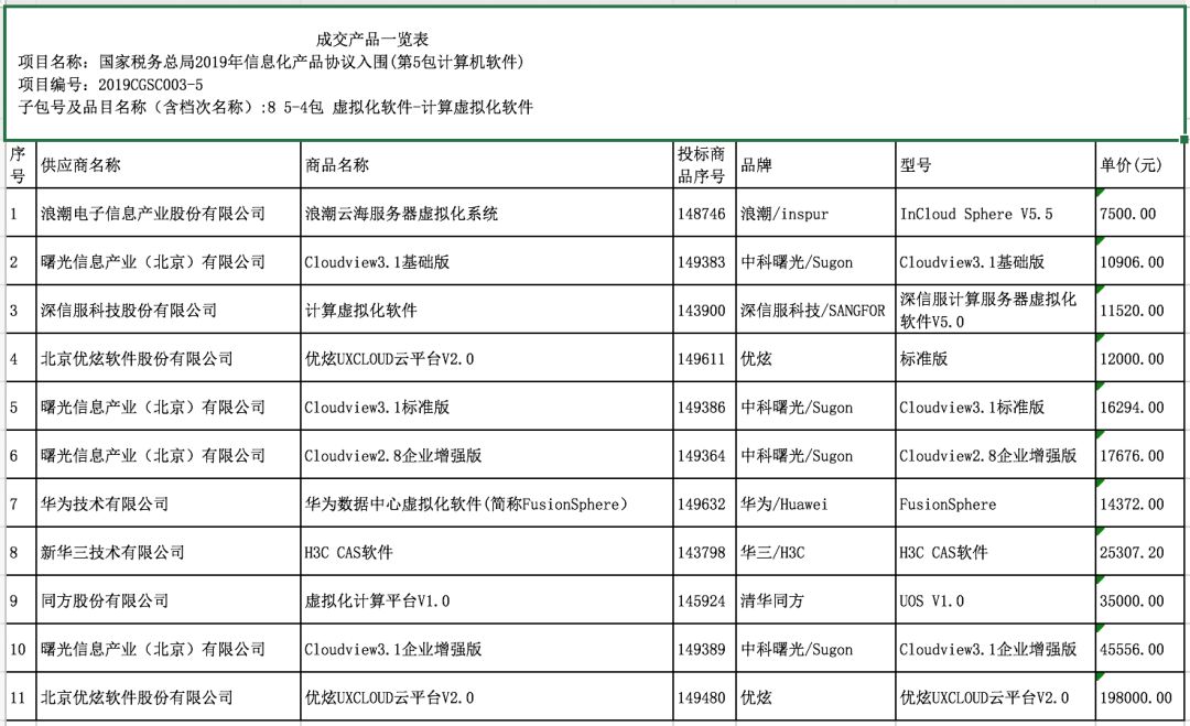 国家税务总局2019年信息化产品协议入围(第5包计算机软件)成交公告