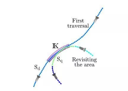 图6. 长度不等的序列之间的匹配。不同的序列用不同的颜色表示。当Sq查询到数据库时,公式(13)中最长序列的归一化项只在观察到相同和最短地图点的K个关键帧(品红区域)中计算。
