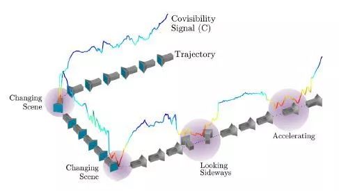 图5. 不同条件引起的共视信号C的局部极值。当遇到一个新的(不一样的)场景时,C可以捕捉相机视图的变化,瞬间侧视,或加速。共可见性度量的强度在[红,蓝]光谱中以颜色编码。
