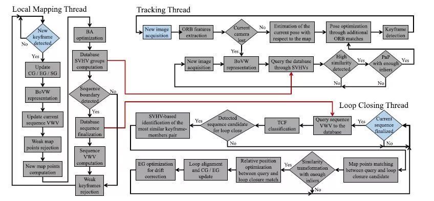 图1 本文定位系统框图。ORB-SLAM的每个并行线程的初始化块都用蓝色高亮显示。红色箭头对应于由本地映射线程共享的数据库度量。