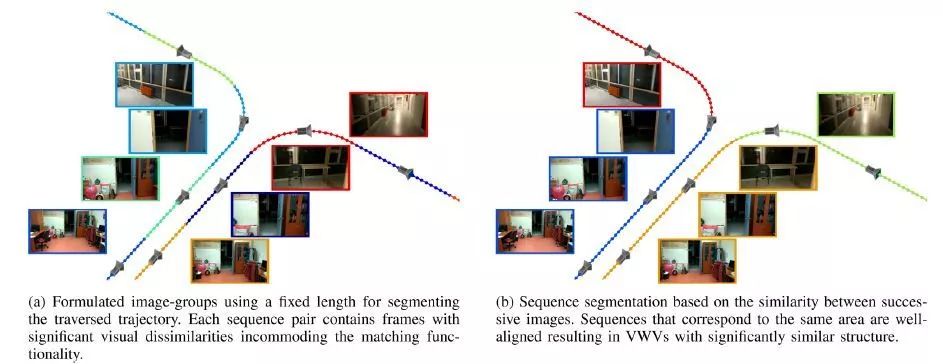 图4. 当系统两次访问同一区域时,正确的序列分割的重要性。相机姿态和示例图像根据它们所属的序列进行颜色编码。