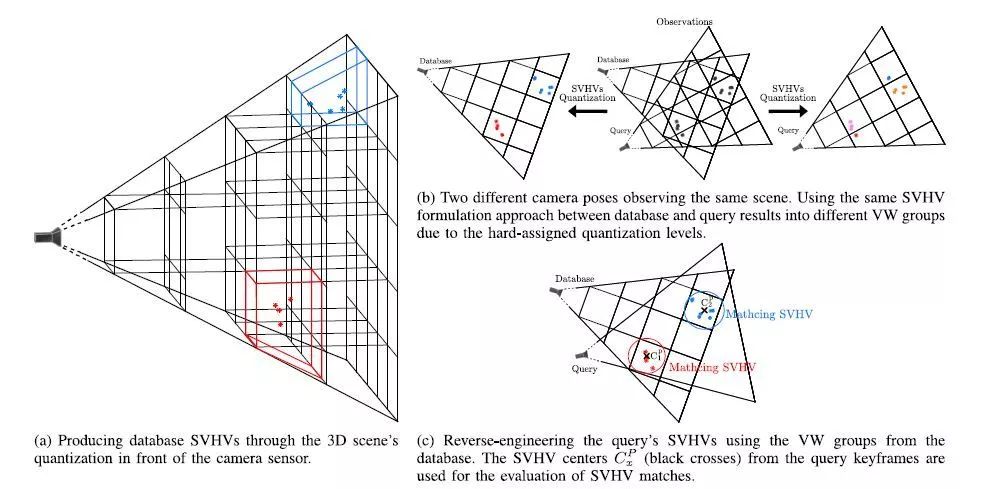图3. 使用来自ORB-SLAM的三维信息,并与查询关键帧匹配,构造数据库SVHVs。星号表示观察到的地图点。不同的颜色对应不同的SVHVs。