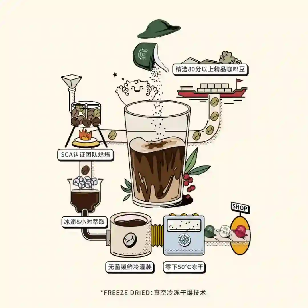 想必很多人和我一样都是在小时候从雀巢知道咖啡,再从星巴克明白什么是咖啡与速溶咖啡,但其实速溶咖啡的历史远比我们想象中的久远。早在一百三十多年前新西兰人 David Strang 便发明并登记了咖啡粉的专利,而后经过数次改良最终由雀巢以喷雾干燥技术正式风靡世界并沿用至今。这种技术简单来说就是利用高温热气喷射咖啡萃取液使其水分蒸发,最后形成可溶于水的咖啡粉,但凡事有利有弊,相比正常手磨咖啡粉制作出来的咖啡,这种速溶咖啡粉在高温下已经失去了咖啡特有的芳香物质,你喝到的就成了一杯毫无生命力的苦水。但雀巢厉害的是想到了给咖啡「调味」,不仅在前期咖啡粉制作过程中添加可溶性碳水化合物增加咖啡香气,还「买一赠一」附上了声名远扬的「咖啡伴侣」,甚至之后直接奶精香精三合一的便携包。这一举动虽仍然被咖啡爱好者诟病「咖啡之耻」,但意外的是被许多之前接受不了咖啡苦涩味的路人所喜爱,成了一杯好喝又提神的「快乐水」。在确定这个选题之前以上便是我对速溶咖啡的所有认知,而因为这种工业化生产的速溶咖啡通常使用品质低劣的咖啡豆,同时我又非常喜欢咖啡中独特醇厚的酸苦滋味,所以可想而知我一直以来有多么嫌弃速溶咖啡。但现代新技术下的速溶咖啡着实让我再一次重新认识了速溶咖啡。