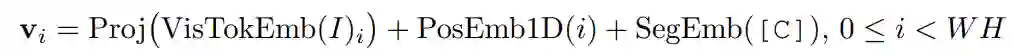 使用 ResNeXt-FPN 网络作为图像编码器,要先抽取原始文档图像的特征图,再将其平均池化为固定尺寸(W×H),接着按行展开平均池化后的特征图,之后经过线性投影,就可以得到图像对应的特征序列。和文本向量的组成对应,图像向量也补充了一维相对位置和分段信息。有别于文本的 [A]、[B] 段,图像统一归入 [C] 段。用特征向量、一维位置向量、分段向量相加得到最终的图像向量: