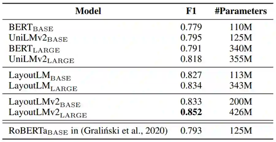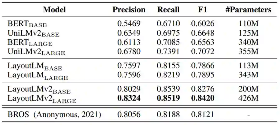 表1:LayoutLM 2.0 在表单理解数据集 FUNSD 上的实验结果