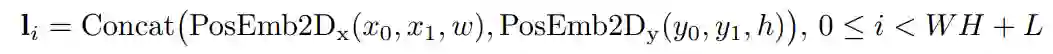 对应于每个词或图像区域在页面中覆盖的坐标范围,使用平行于坐标轴的边界框(bounding box)表示布局信息。LayoutLM 2.0 沿用了1.0的处理方式,用4个边界坐标值、宽、高来表示一个边界框。最终的布局向量由6个特征对应的向量拼接得到: