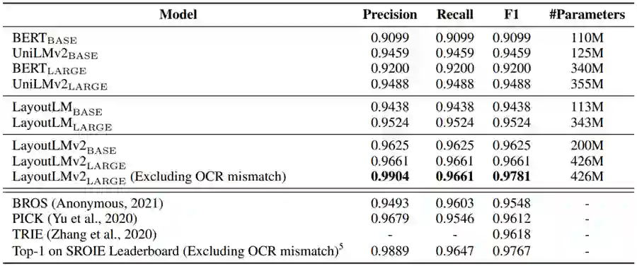 表3:LayoutLM 2.0 在票据理解数据集 SROIE 上的实验结果