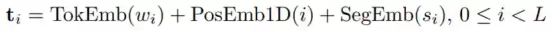 再将词向量、一维位置向量、分段向量(代表 [A] 或 [B])相加得到文本向量,算法公式如下: