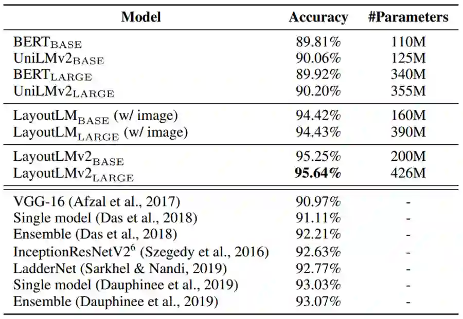 表5:LayoutLM 2.0 在文档图像分类数据集 RVL-CDIP 上的实验结果