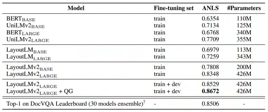 表6:LayoutLM 2.0 在视觉问答数据集 DocVQA 上的实验结果