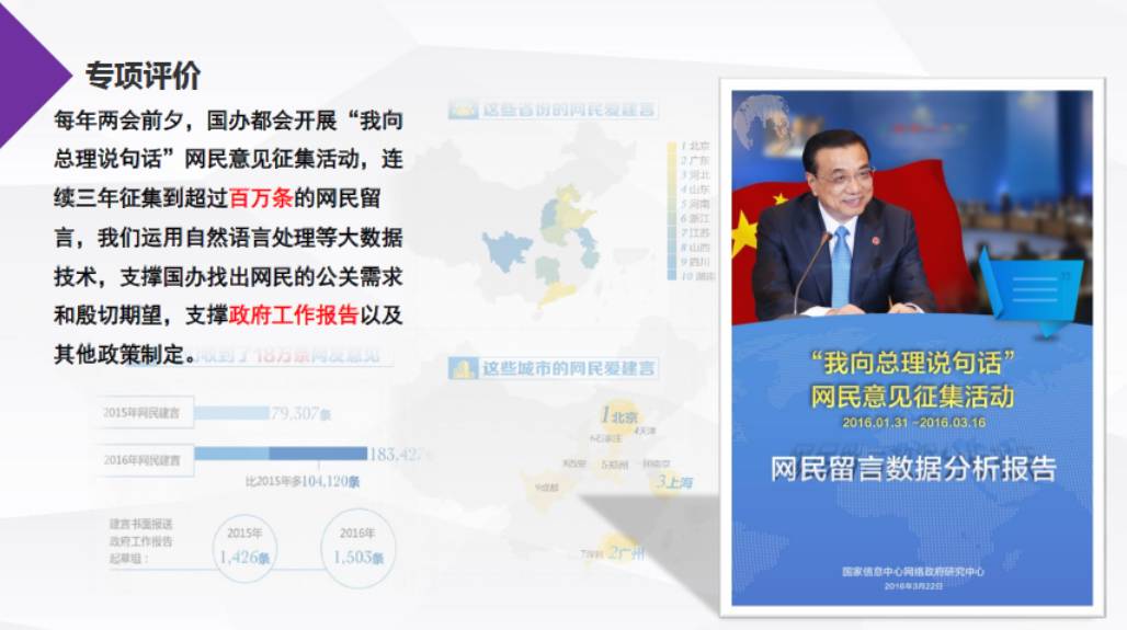 “我向总理说句话”日常向大家收集对政策的建言,通过对连续三年收到的百万条网民留言进行分析,能够支撑政府工作报告以及其他政策的制定。2016年我们挑选了2000多条网民建言报告给国办,其中有101条建言和两会上总理做的政府工作报告中的表述高度契合。