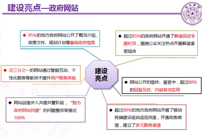 团队从全国3万多个政府网站中抽取了认为做的较好约400到500个网站,从信息发布、解读回应、开放参与、平台支撑、网站应用五个纬度进行绩效评估,发现了亮点,也找到了存在的问题。