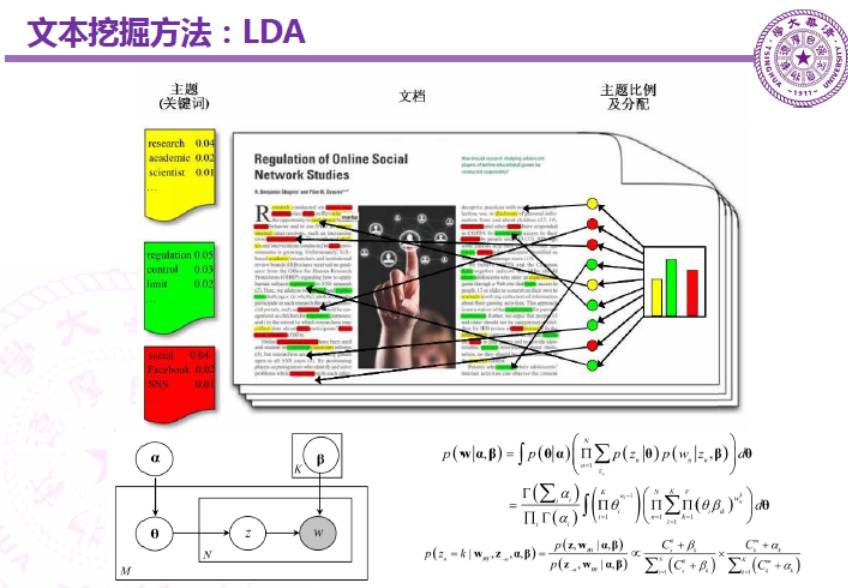 LDA方法通过将网站上的每篇文章的词语进行统计,若干词语集中形成一个主题,从这些词语里提出来这些主题,描述成一个概率矩阵,变成传统的统计方法能够处理的问题,这是文本挖掘的基本思路,将海量的网站信息变成概率矩阵,就能看到每篇文章跟这个主题的关系,就能做进一步分析。