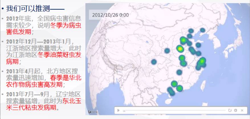 在全国访问农业部网站的统计结果中抽取访问病虫害相关的数据,按照地理纬度打点,标记出来画成热力图并把一年热力图串成一帧帧动画播放看整个效果,推测这张图可能和全国实际发生的病虫害情况一致。甚至还可以推测出一些结论,比如2012年底冬季病虫害信息比较少,冬季是病虫害的低发期,12月到1月江浙地区的关注量非常大,可能是冬季油彩蚜虫的发病期。
