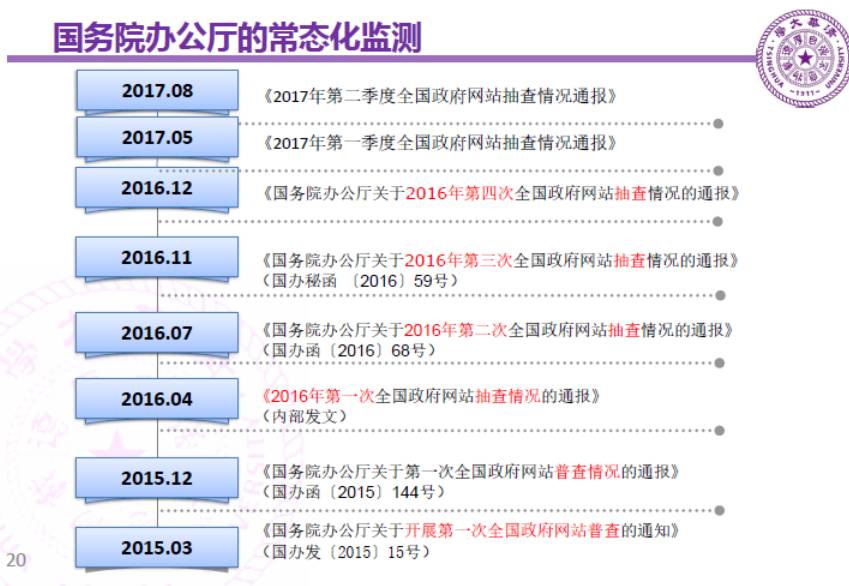 2015年国务院办公厅第一次对全国政府网站普查,之后又陆续进行几次抽查督察。主要解决政府网站的四方面问题,“认识不足”、“家底不清”、“保障不利”和“基础不实”。