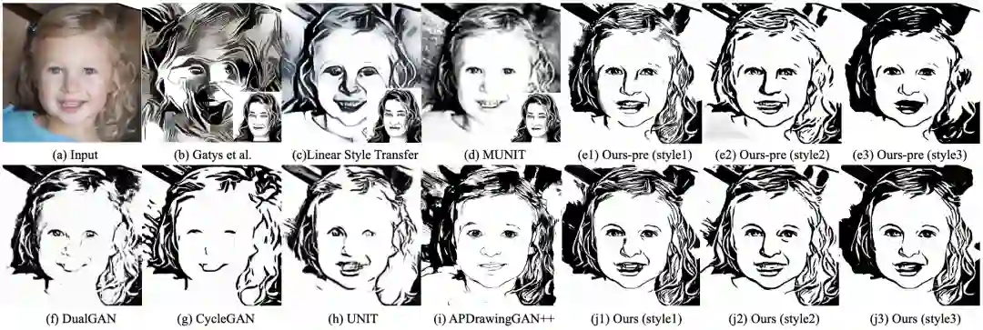 (a)输入人脸照片;(b-c)风格迁移方法:Gatys和线性风格转换方法;(f)单模态的图像到图像的转换方法:DualGAN,CycleGAN,UNIT;(d)多模态的图像到图像的转换方法MUNIT;(e)论文的方法去除质量损失,输出的三种风格;(i)使用成对训练数据的肖像生成方法APDrawingGAN++方法;(j)论文方法生成的三种风格。