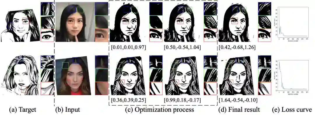 给定(a)中的目标「新」风格肖像画(即在训练数据中看不到的风格),我们通过优化风格损失,找到合适的风格特征向量,生成与目标相似的肖像画。优化过程如(c)所示,最终生成的结果如(d)所示。优化过程中风格损失的变化如(e)所示。